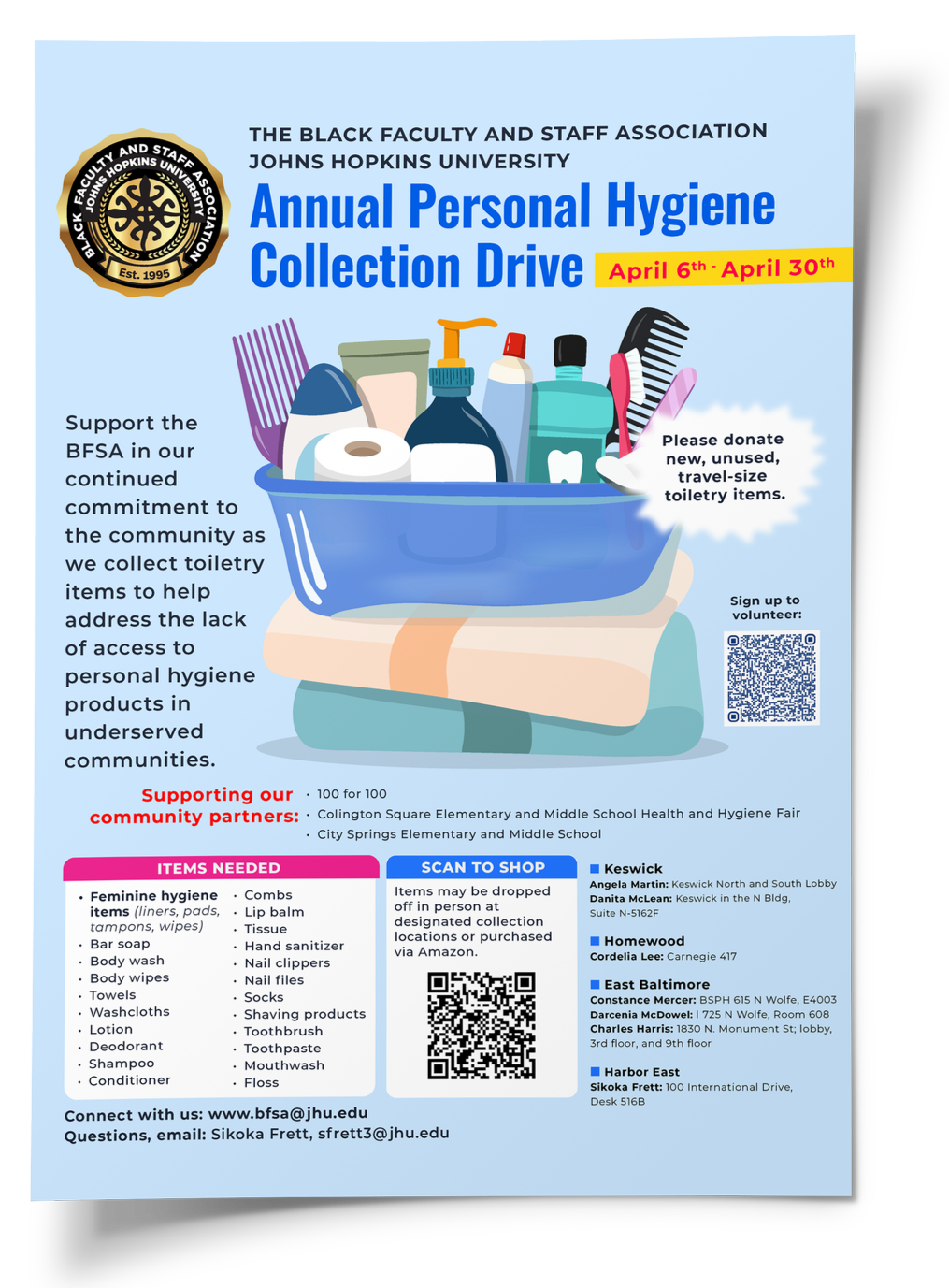 JHU BFSA Annual Hygiene Drive flyer campaign design.
